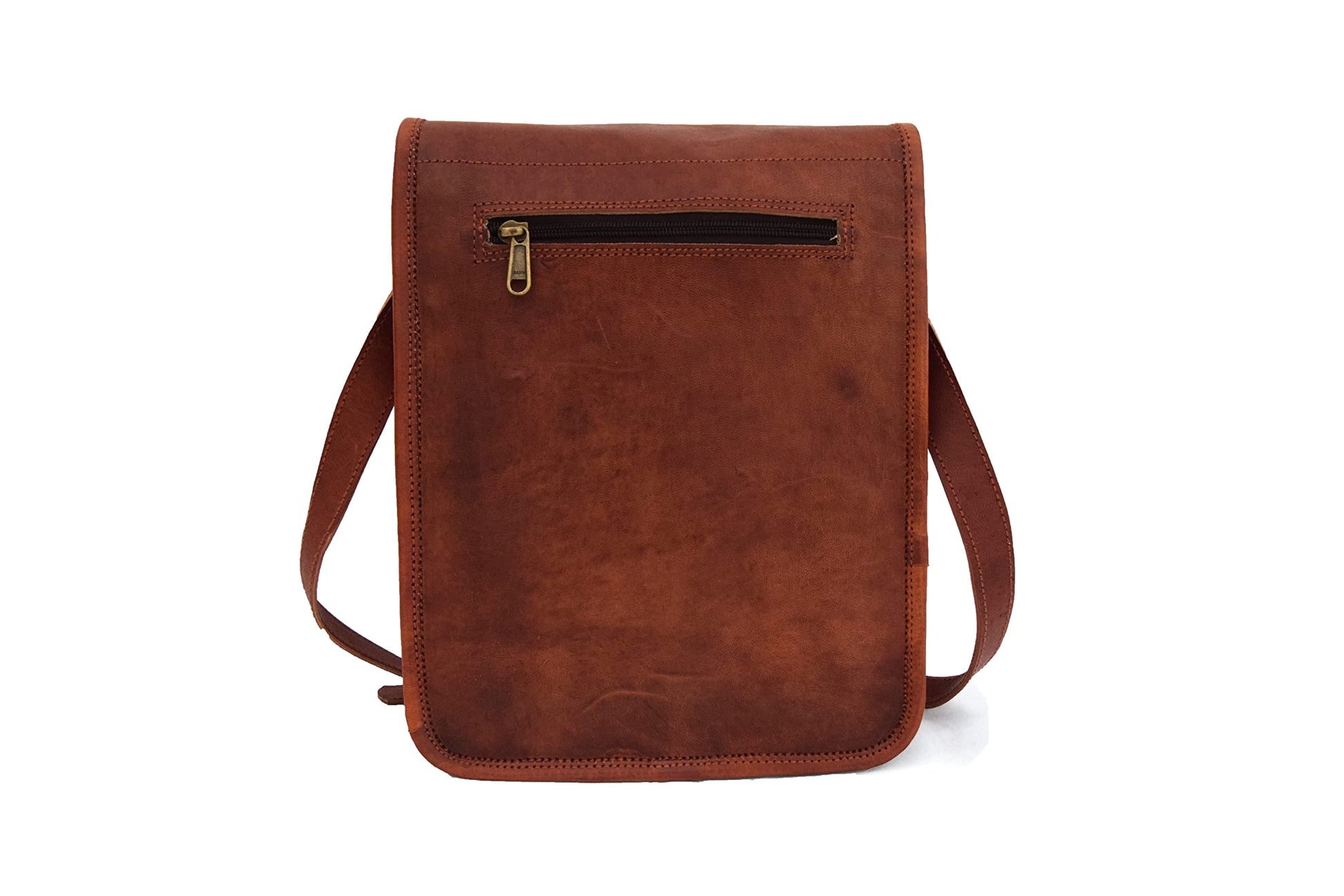 HANDMADE VINTAGE LEATHER CROSSBODY MESSENGER BAG ------ A beautifully handcrafted vintage style leather messenger bag that you will still be using years from now. ----- 1.Handcrafted Vintage Goat Leather (Full Grain Leather) Messenger Bag / Crossbody Bag / Shoulder Bag / Handbag / Sling Bag. 2.This bag can fit iPad / Tab Mini. 3.A perfect small crossbody bag to take along with on holidays / travel / day’s out. 4.Bag’s Measurements ------ Outside Sizes (In inches) - 9' (Length) x 11' (Height) x 3' (Width) ------ Inside Sizes (In inches) - 8.5' (Length) x 10.5' (Height) x 2.5' (Width) .Bag’s Features -------- Front: 1 small pocket and 1 zipper pocket on backside ------ Inside: 2 zipper pockets and 2 partitions ------1' wide and 58' long adjustable leather shoulder strap. 6.Material Description- Genuine Goat Leather Processed (No bad smell) -------- Naturally tanned with sunflower oil only, no use of dye or chemicals---- Inside flap is nicely lined with polyester nylon ------ Heavy Duty Antique Brass Solid Accessories ------- Double stitching for more durability and better look.