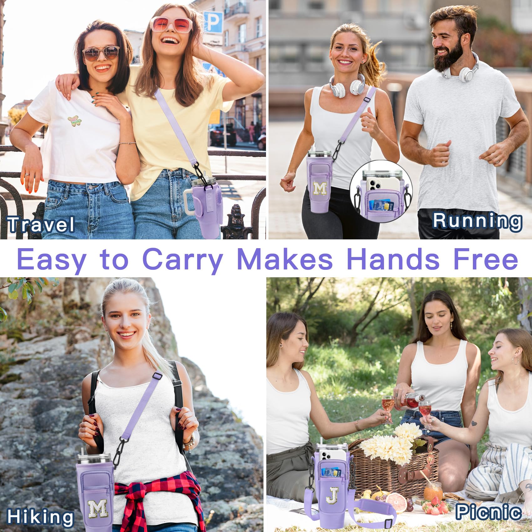 - ❤️【Perfect for Stanley 40 oz Tumbler with Handle】Initial letter water bottle holder bag with strap is specially designed for stanley 40oz tumbler. Glitter letter patch, phone pocket design, fine stitching and snug fit, making your water bottle bag more stylish, unique,and better protecting your tumbler.A preppy stanley cup accessories for stanley fans.