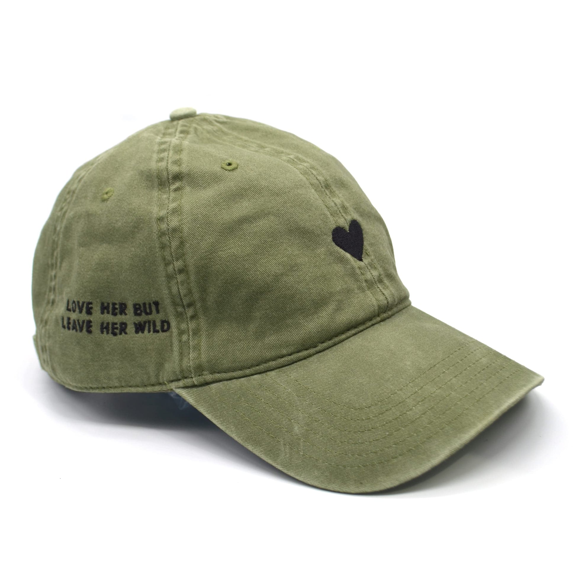 Dad Hat: Vintage washed style 100% Cotton, with the quote Love Her But Leave Her Wild on the side with metal buckle closure and a simple, elegant embroidered heart on the front.