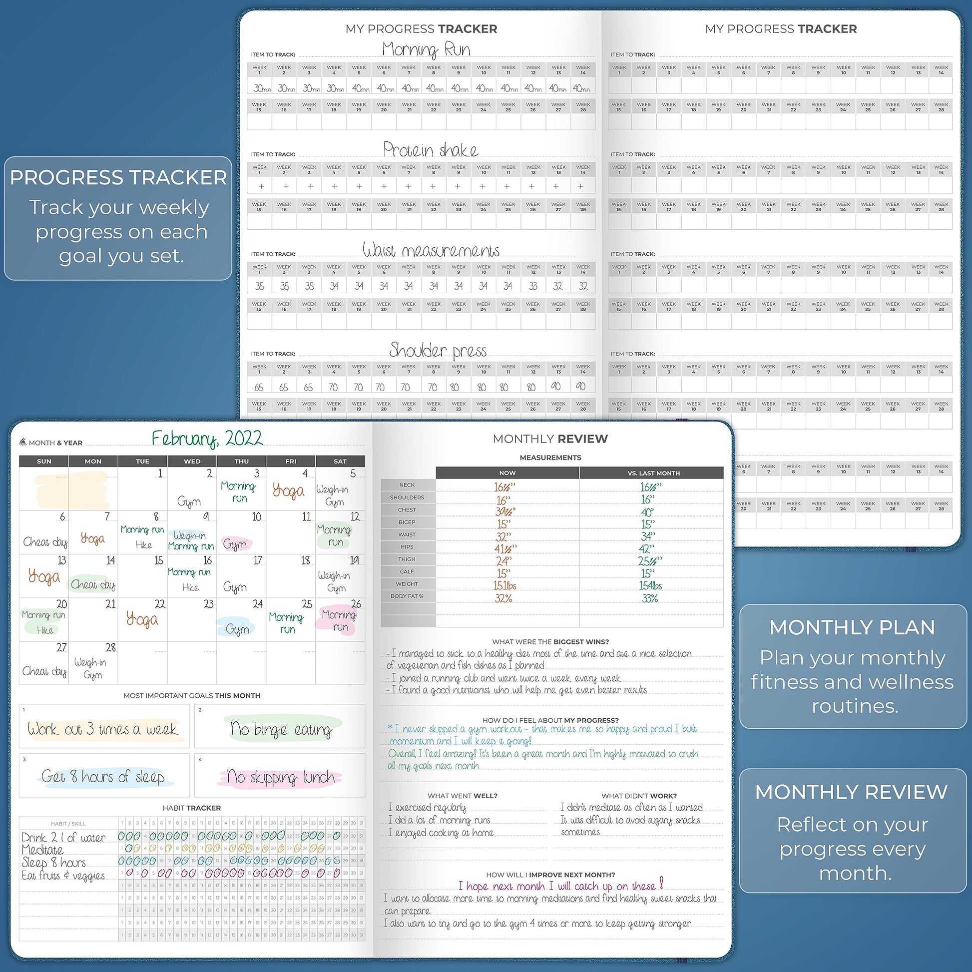 - TRACK YOUR PROGRESS WITH TRACKERS – This fitness planner includes a body measurement tracker, a weekly progress tracker, a daily habit tracker, and 6 comprehensive monthly reviews to reflect on your performance at the end of each month.