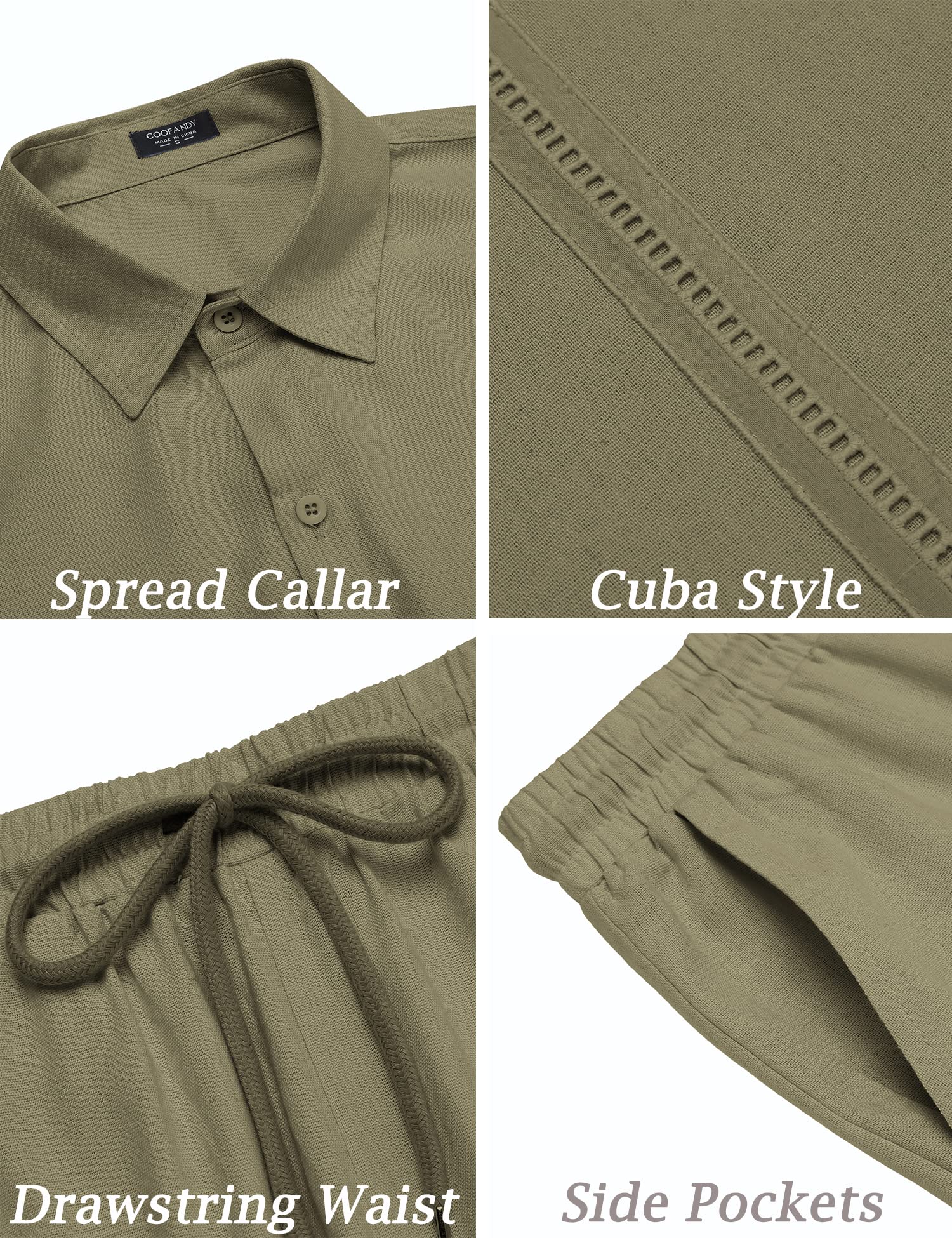 - Linen Fabric ---- The two pieces men's linen set is made of high quality linen fabric, cool and breathable, soft and skin-friendly, no shrink, no fade, quick dry. Get the linen shirt and short sets worth in summer.