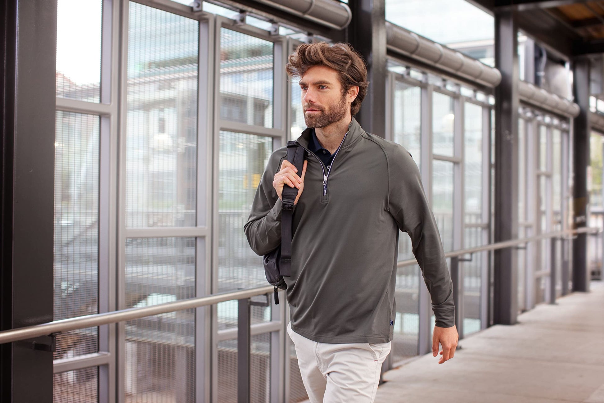 The iconic Adapt Eco Knit Stretch Quarter Zip is engineered for exceptional versatility, designed to be your favorite mens big and tall quarter zip pullover for your active life: golf, skiing, travel, workouts, work, recharging, or a night out. The supremely comfortable and lightweight brushed back fleece is blended from certified eco-friendly recycled drytec polyester with spandex for stretch and warmth against the skin so you can do well for yourself and the planet.