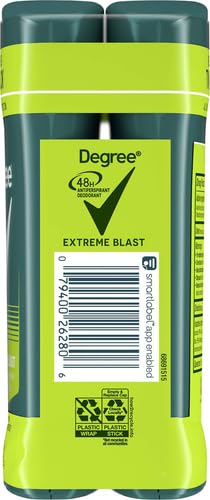 Details: Degree Men Extreme Blast Antiperspirant Deodorant delivers 48-hour sweat and odor protection to keep you feeling dry and fresh. This antiperspirant deodorant for men works as hard as you do and offers 48-hour protection, so you can take on the day. Our Extreme Blast Antiperspirant Deodorant features a refreshing kick of crisp, citrus freshness. The powerful antiperspirant deodorant responds when you need it most, so you can stay confident without having to worry about slowing down. You can be confident youâll be protected from sweat and odor by this antiperspirant for men. Stay fresh and feel clean from morning to night. Simply twist, glide and get moving. The crisp, energizing scent helps to keep you as fresh as when you started your day. Stay dry, cool, and confident thanks to Degree Men Extreme Blast Antiperspirant Deodorant. At Degree, we want to inspire⯠the confidence in everyone to move more and go further. Weâre here to support⯠your journey through an antiperspirant that movesâŻwith you and helps you go beyond your limits. As well as increasing our use of reusable materials, weâre making it easier for you to recycle our antiperspirant and dry spray packaging. Degree. It wonât let you down.