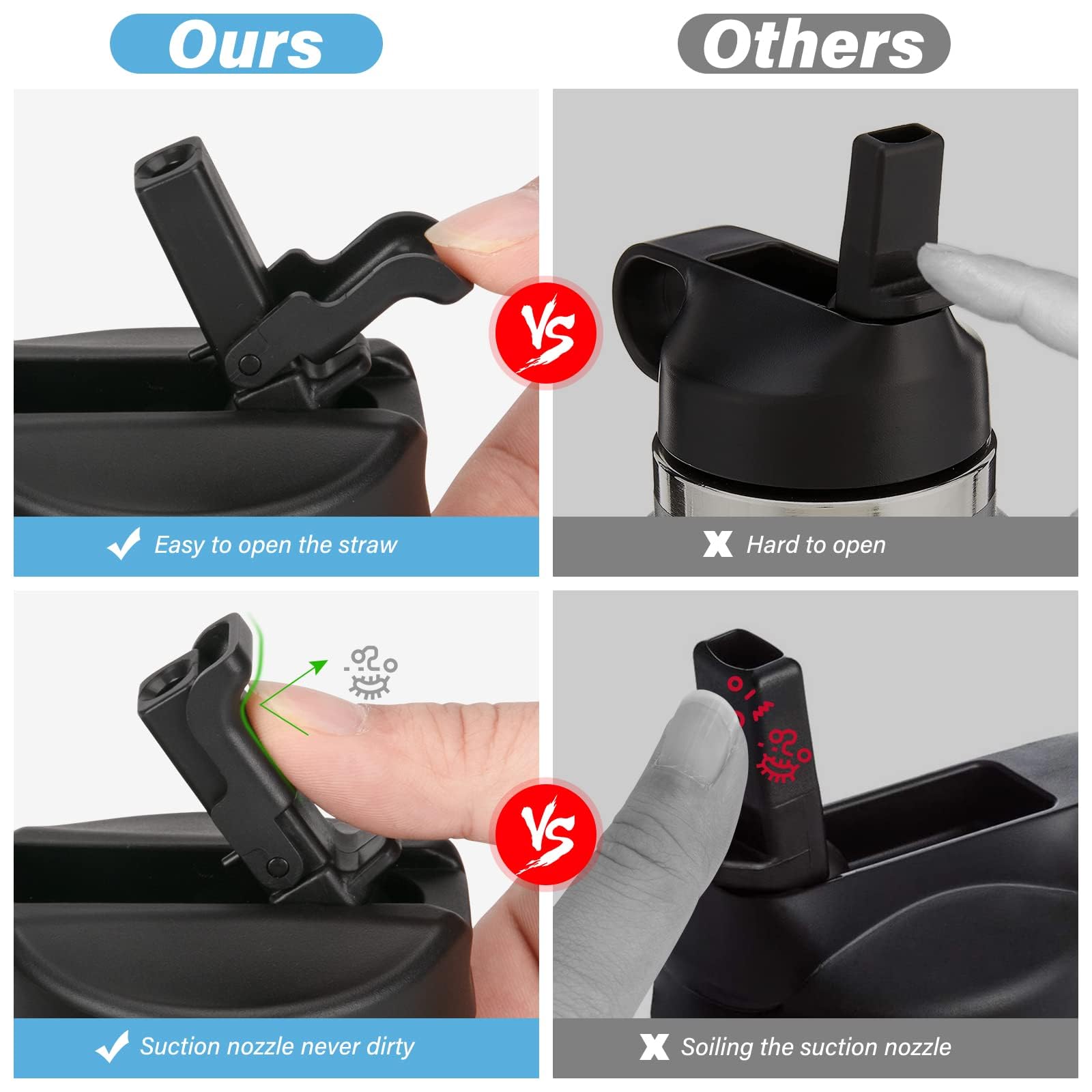 - Auto Flip Lid & Straw Lid: It is designed for an easy, one-handed drinking experience. The chug-lid design opens with the push of a button for high liquid flow and one-handed drinking. Straw lid with dust cover can effectively prevent dust from entering and avoid touching the nozzle by hand, which is more convenient and sanitary