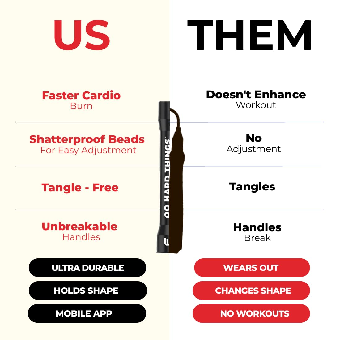 - Quality Materials; We make high quality products for competitive jump rope athletes. This Do Hard Things skipping rope features our 5' unbreakable plastic polymer handles and 1' shatterproof plastic beads. This adjustable jump rope is a durable workout jump rope that can be used indoors/outdoors.