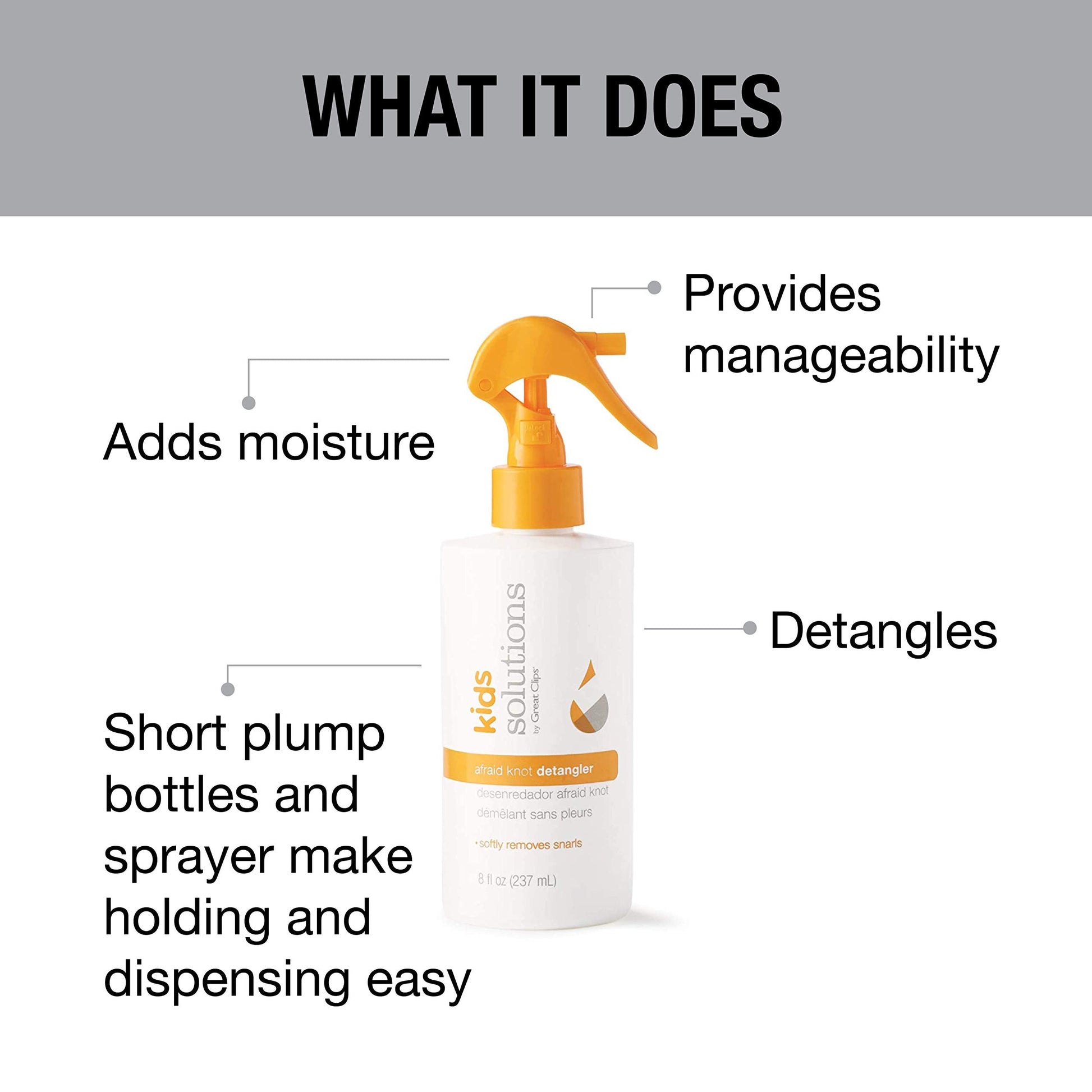 - A VERSATILE LIGHT SPRAY: Our Solutions by Great Clips Kids' Afraid Knot Detangler can be used as a detangler, styler, or protectant in your little one's hair. Its formula is designed for kids' hair and scalp, so there's no harsh or yucky chemicals included.