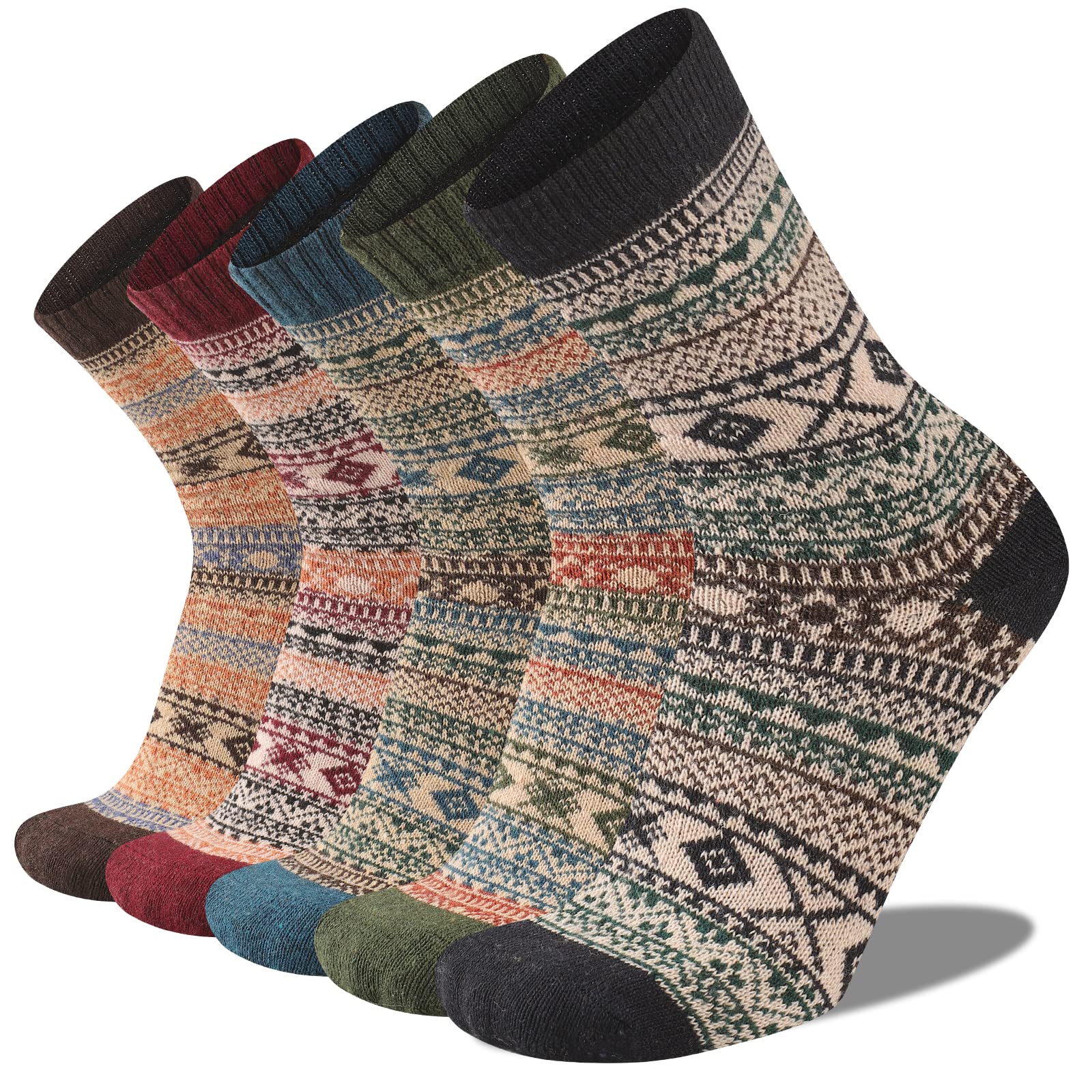 - [FASHIONABLE GIFT CHOICE]: Mens warm wool socks with vibrant colors and patterns are great presents in Christmas,birthday, New Year or other holiday.And these thick wool socks make the perfect present for family, friends and anyone you love.One package has 5 pairs mix colors winter thermal wool socks.