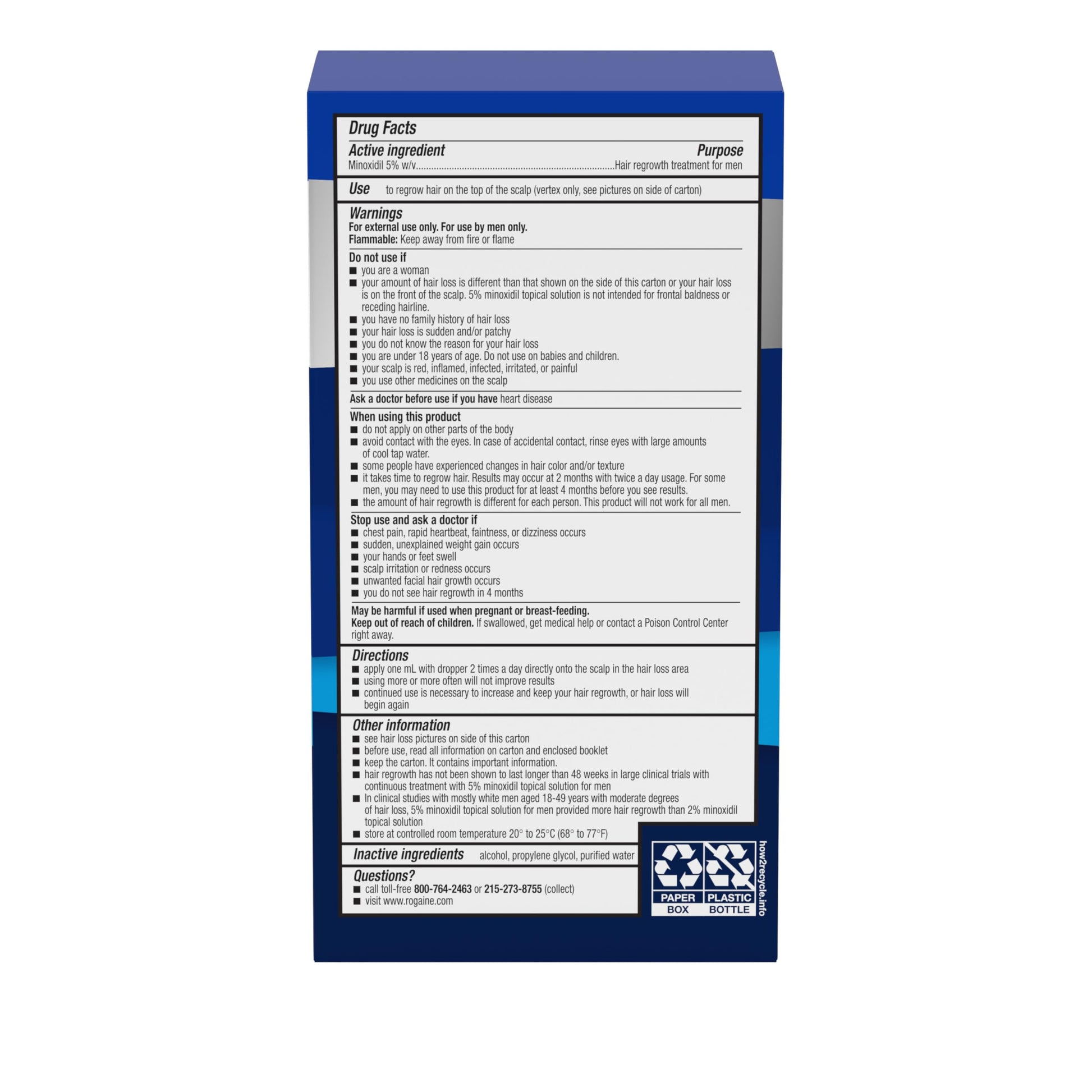Help treat hair loss & regrow thinning hair with Men's Rogaine 5% Minoxidil Liquid Hair Regrowth Treatment. The 1st FDA approved brand for topical use of minoxidil, Men's Rogaine Extra Strength 5% Minoxidil Solution is clinically proven to improve hair regrowth by by 34% after 16 weeks.* This men's hair regrowth treatment with minoxidil penetrates your scalp to restore inactive hair follicles & increases protein production to help lengthen you hair's active growth phase. Men's Rogaine hair regrowth solution is for men who have a general thinning of hair on the top of the scalp & is not intended for frontal baldness or a receding hairline. This thinning hair treatment for men comes in an unscented topical solution that is easy to use: simply apply 1 milliliter directly to your scalp twice daily & massage it in. Like all Rogaine hair loss products, it is designed to fit easily into your daily hair care routine.