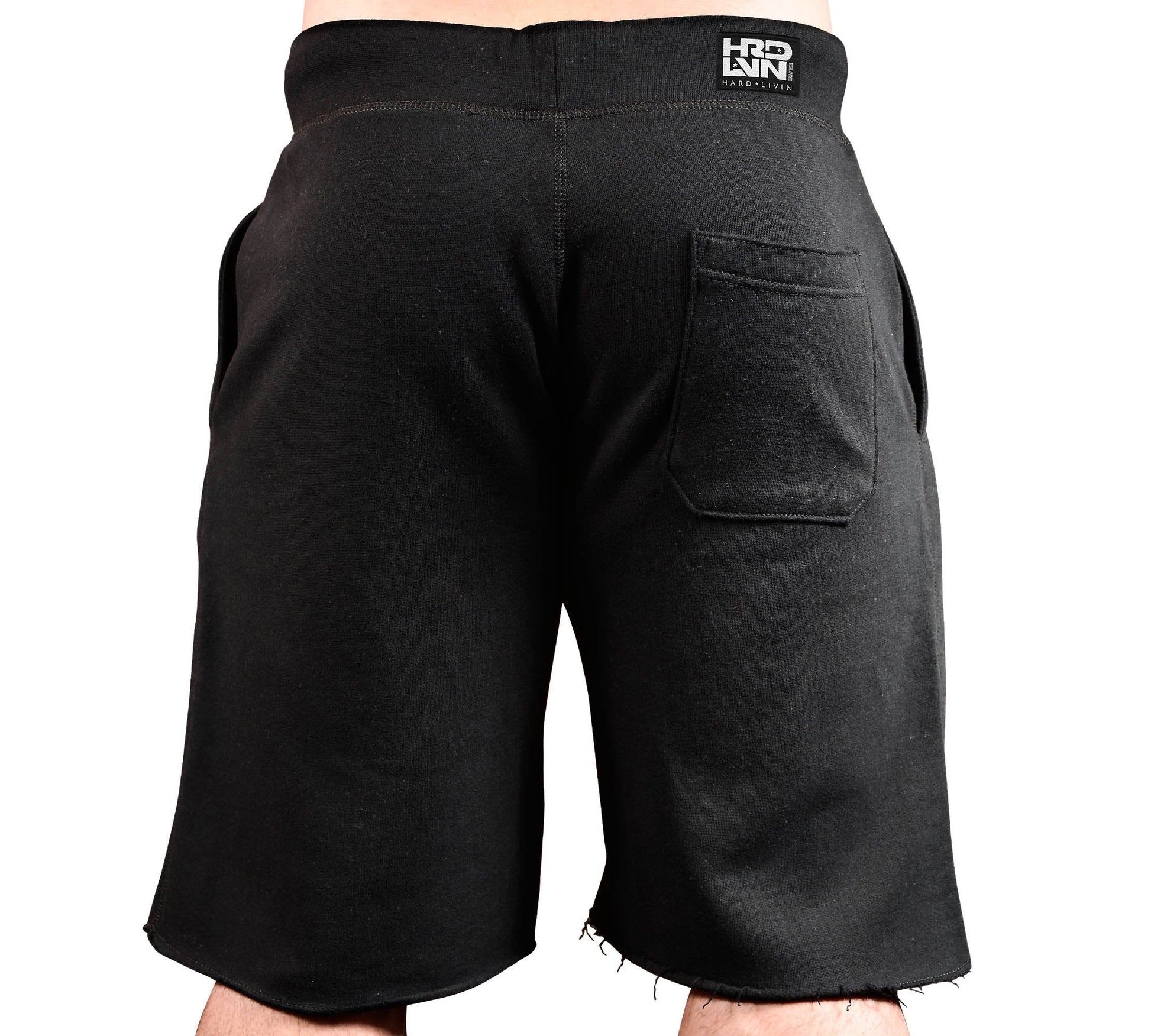 This longer length rough-cut sweat-shorts short with pockets is for the hard-core bodybuilder, powerlifter or weightlifter alike. The 'HRD-LVN Street Apparel' artwork is positioned at the bottom left side of the shorts. If you push the limits like you push the iron then Hard Livin bodybuilding, powerlifting, weightlifting, workout clothes, and overall fitness apparel is for you. WARNING! You just might unleash the beast.