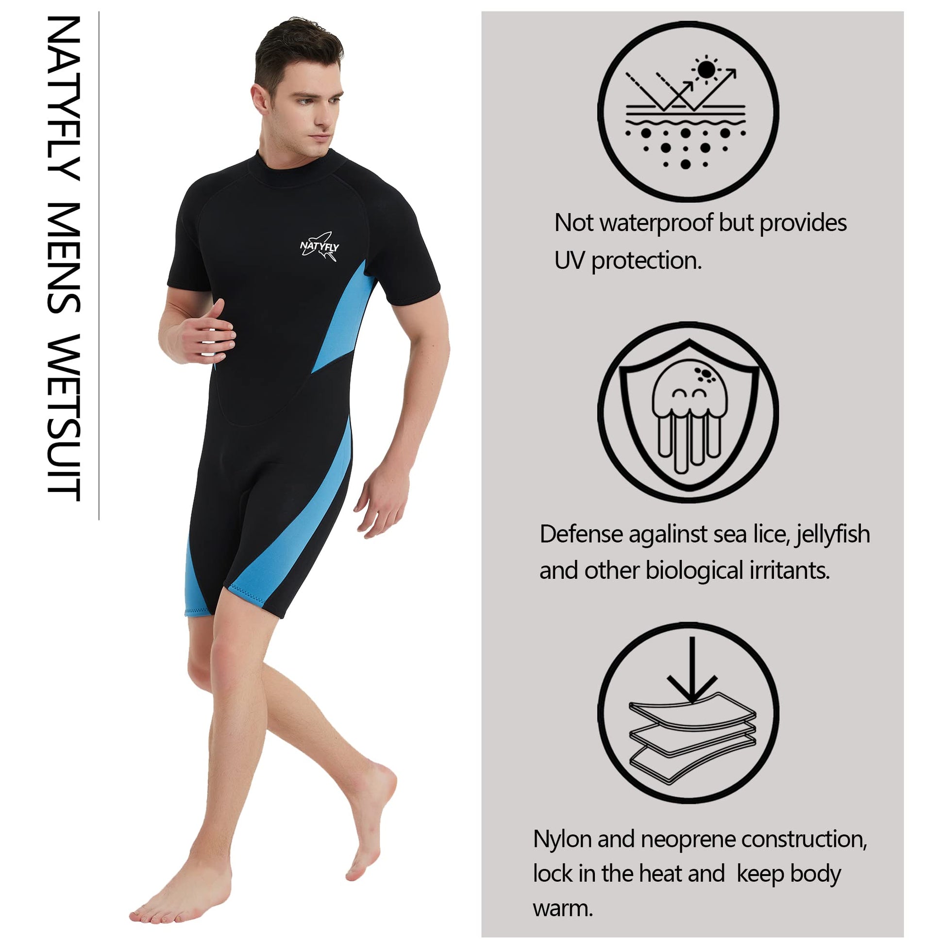 NATYFLY Mens Wetsuit 3mm Neoprene Wet Suit Men, Youth Full Body Shorty Wetsuit for Men in Cold Water, Long Sleeve Back Zip Diving Suits for Water Sports