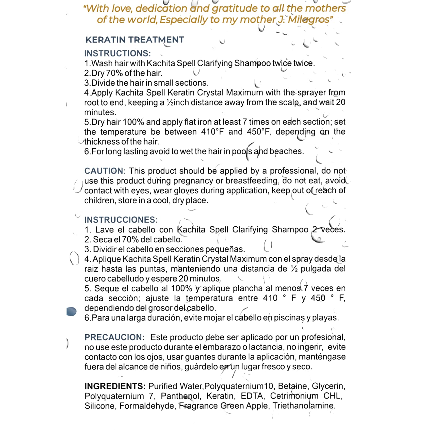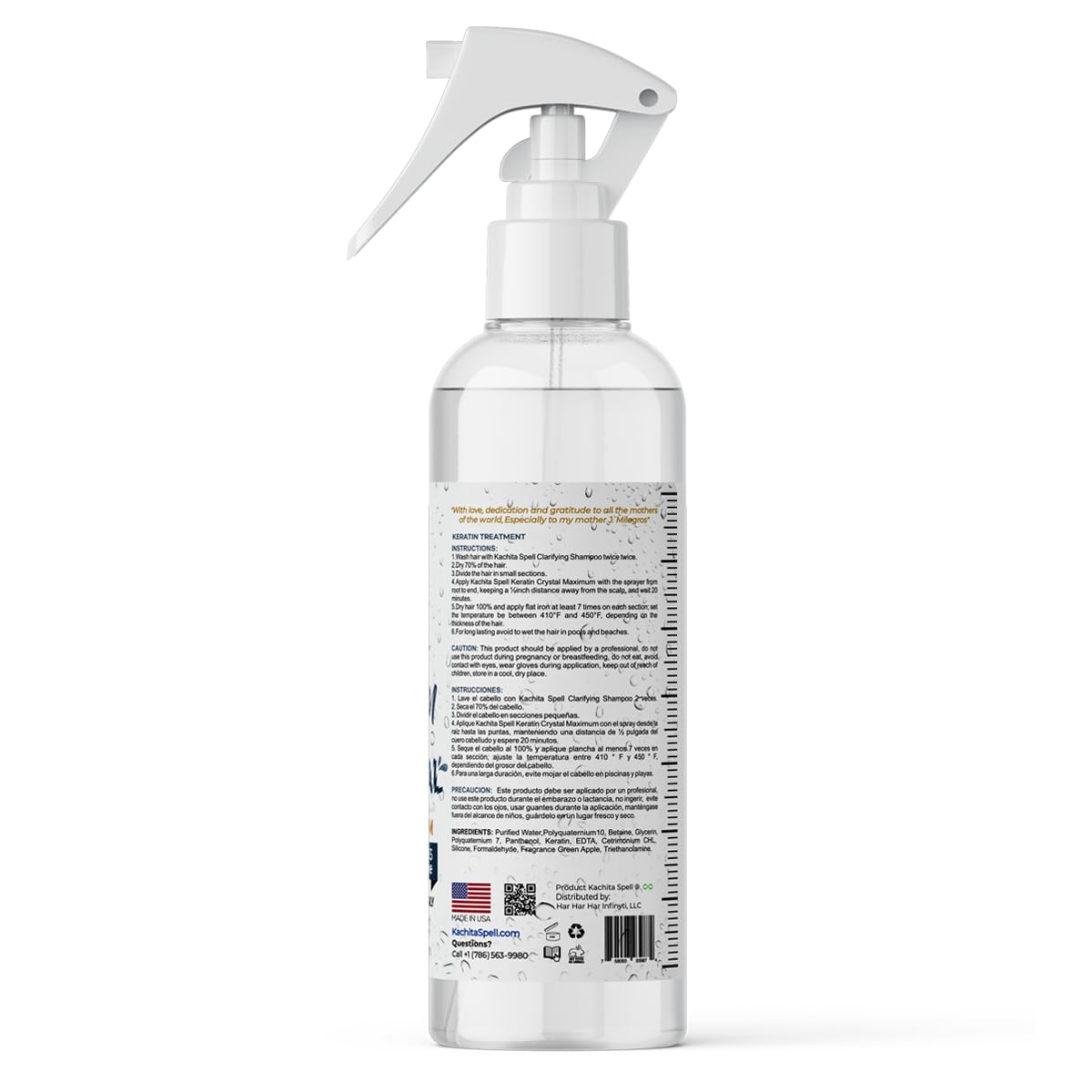Details: Keratin Kachita Spell Crystal Maximum liquid 16 oz for all hair types with delicious smell of Green Apple. Our Keratin with formaldehyde also has the best market efficiency in Liquid Keratin. Its application is like any keratin. Do not miss this opportunity! Think beauty is to achieve the best for us long term and if you care about your business barbers think that the quality of your products is what will make the first choice for customers. We took care of quality and the best price. When you think of quality, think of us. Advanced yet fast and simple to use keratin treatment that instantly straightens, smooth, repairs, conditions, and strengthens the hair using a formula which restores vitality by repairing the hair from the inside out. The amazing results will leave hair elastic, flexible, and soft with a naturally vibrant shine. A quality, effective and efficient keratin treatment very easy and fast to apply, it has an atomizer that allows you to apply the product very easily without the need for brushes or containers. Revolutionary hair re-constructor and volume reducing treatment that eliminates kinky and frizzy hair textures leaving hair straight healthy and shiny. Keratina Queratina, Keratina liquida Kachita Spell.