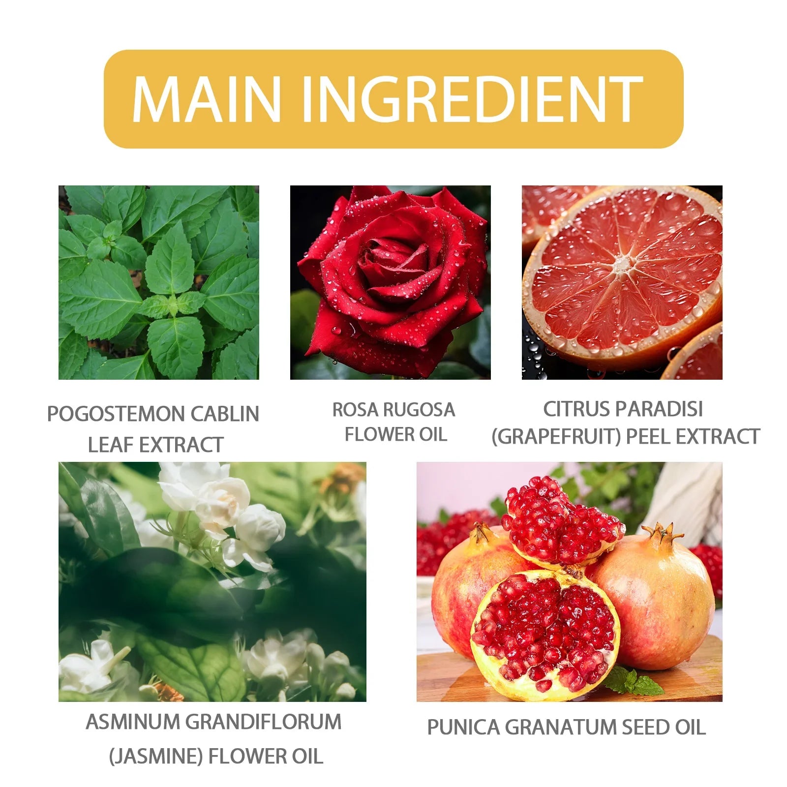POGOSTEMON CABLIN LEAF EXTRACT、ROSA RUGOSA FLOWER OIL、CITRUS PARADISI (GRAPEFRUIT) PEEL EXTRACT、ASMINUM GRANDIFLORUM (JASMINE) FLOWER OIL、PUNICA GRANATUM SEED OIL