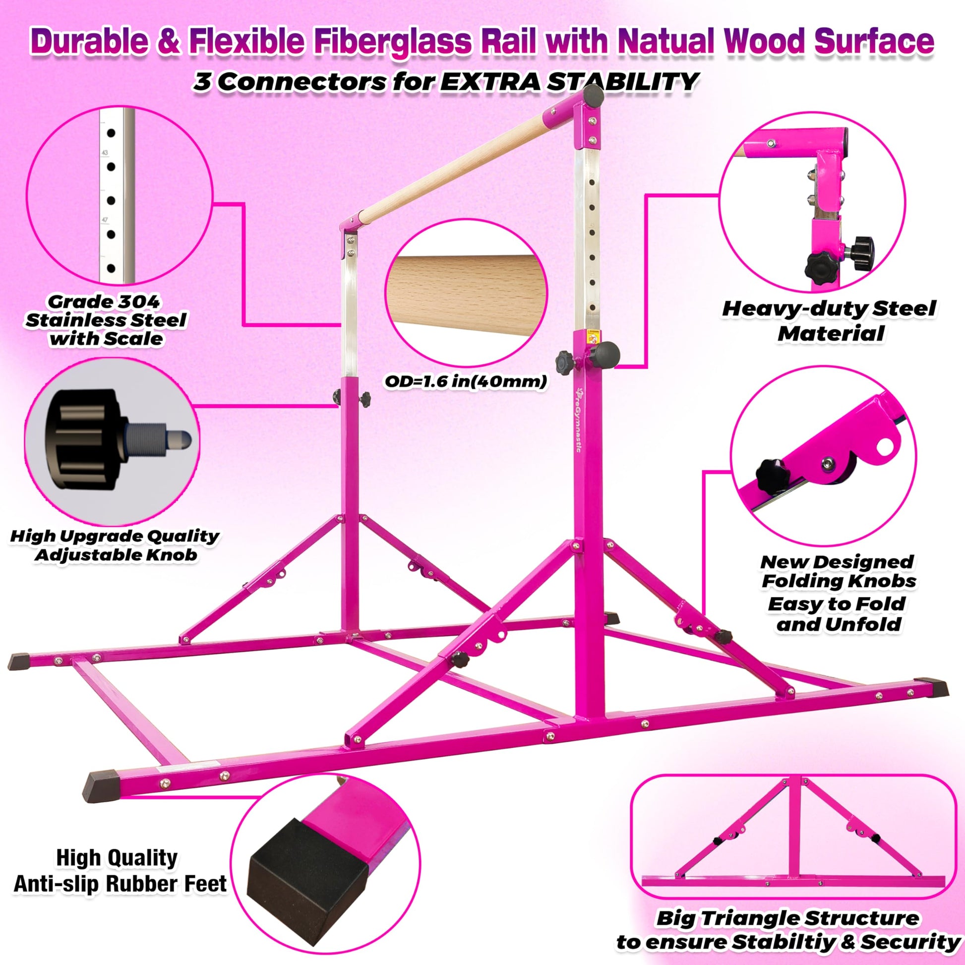 - Professional Gymnastics Bar: It could bring unexpected benefits to gymnasts. Thickened materials, big triangle Structure, three connectors, 6 ft bases…all offer exceptional versatility and durability for athletes of all levels. It can bear up to 500 LBS