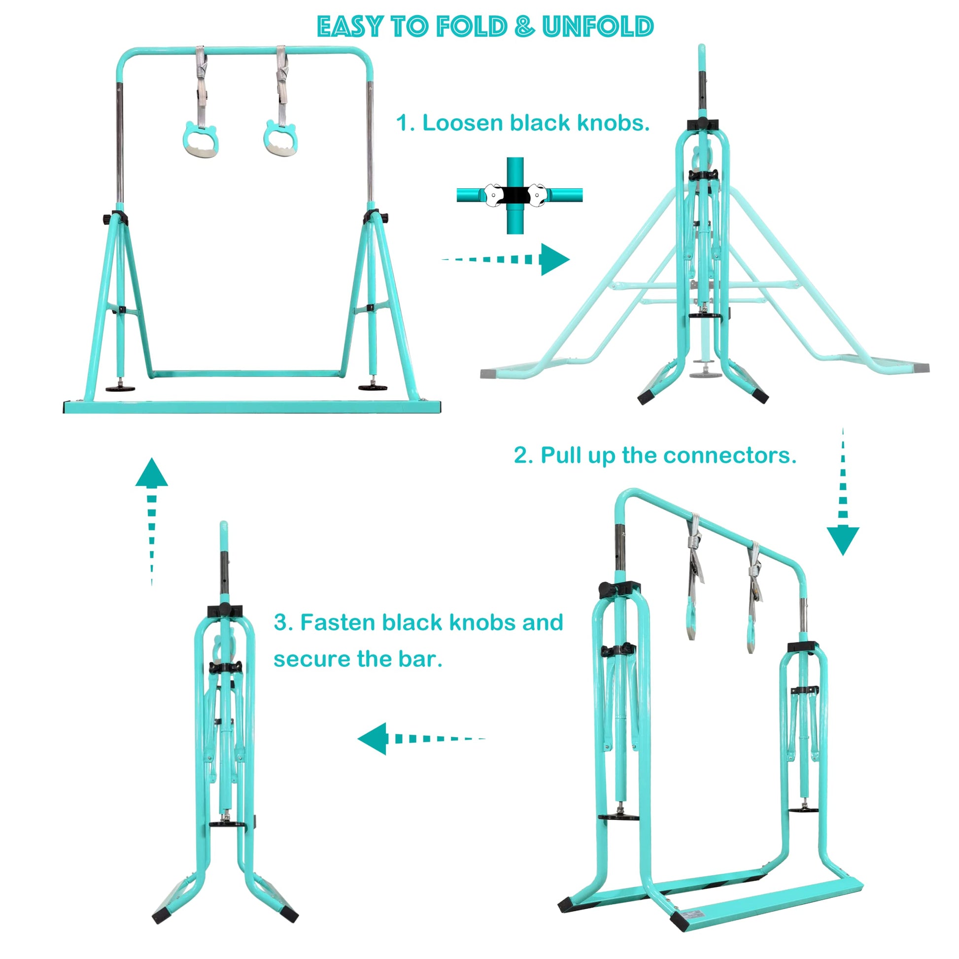 - STURDY FOLDABLE GYMNASTICS BAR: It's made of thickened steel tubes, providing a safe platform for practicing various gymnastics moves. Four black knobs have been added to secure the bar when fold and unfold, making it safer when kids exercise on it