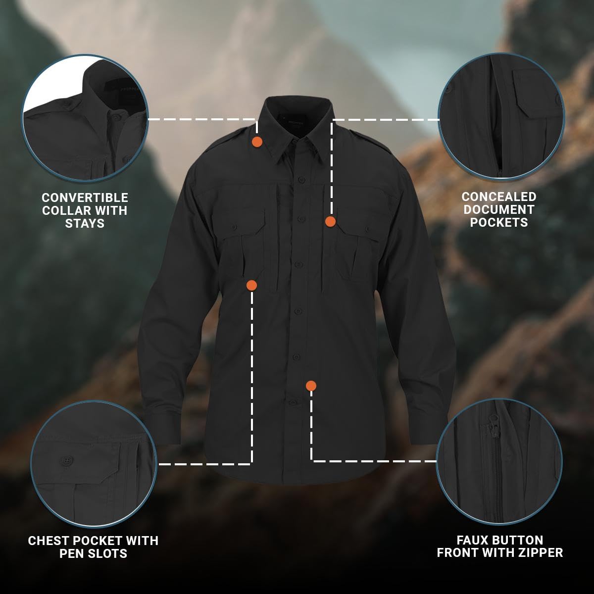 - SMART DESIGN: The Propper Long Sleeve Tactical Shirt is made with 65% polyester 35% cotton lightweight ripstop and has a clever concealed zipper front closure hidden behind a traditional button placket façade