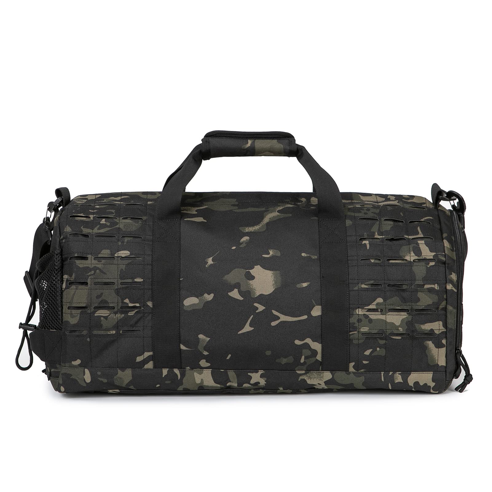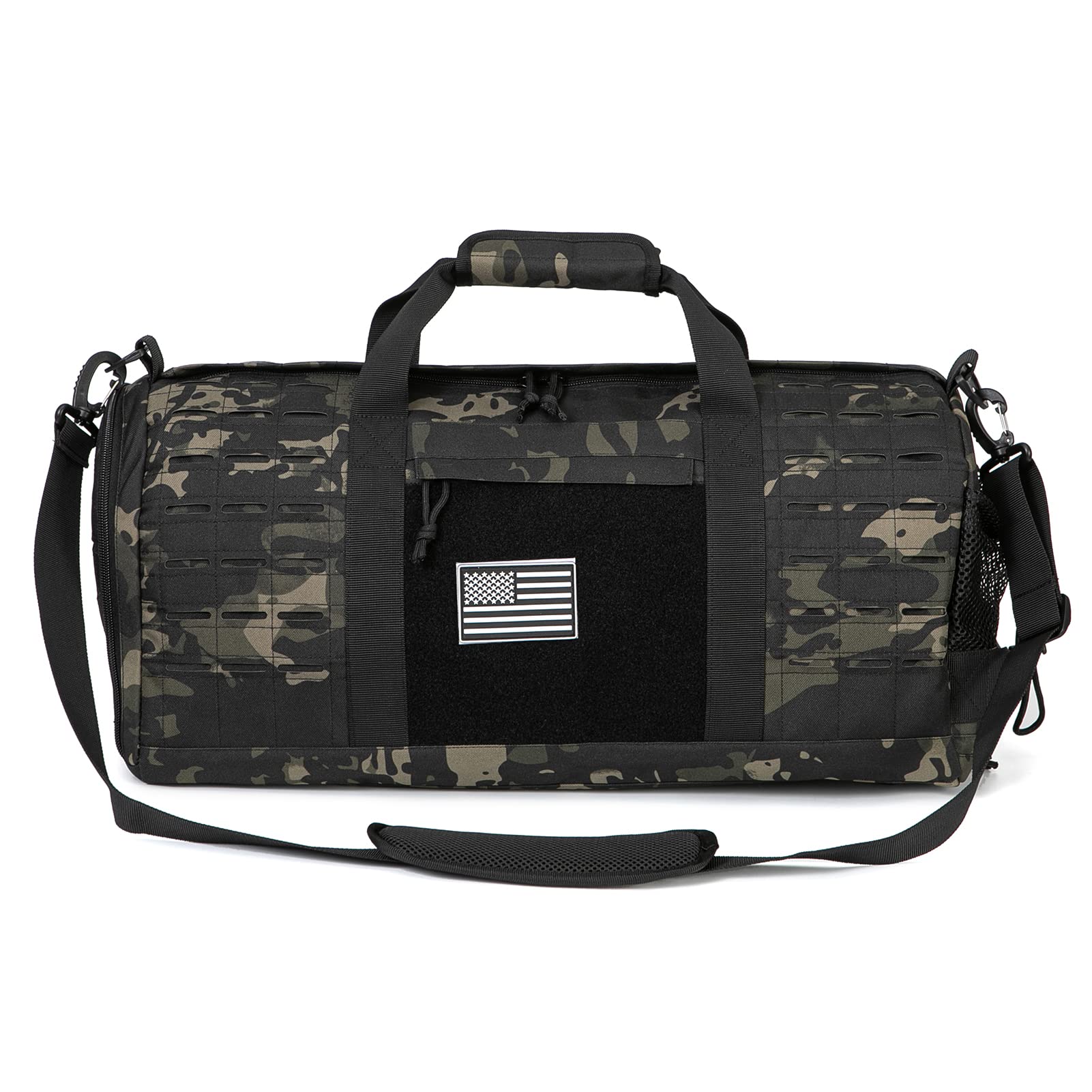 - 【PERSONALISE】 The Laser Cut Molle Webbing Design making this tactical duffle bag special. it uses Two Layers Fabric Laser Cutting MOLLE Hang System to allow all range of pouches attachment. Large area of Velcro to personalise with our range of patches. One US flag patch for gift(can be removed)