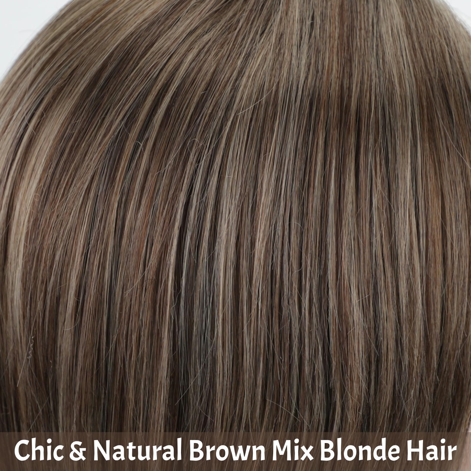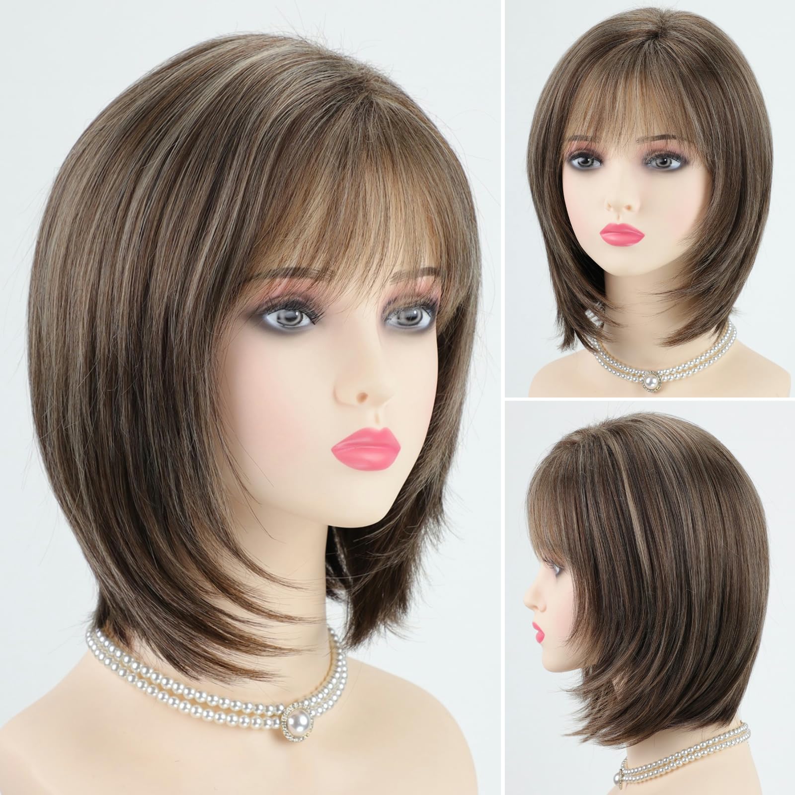 RENERSHOW Brown Highlight Short Pixie Bob Wig with Bangs Layered Brown Mix Blonde Wigs for Women Chin Length Straight Synthetic Wig Natural Looking Daily Party Wig