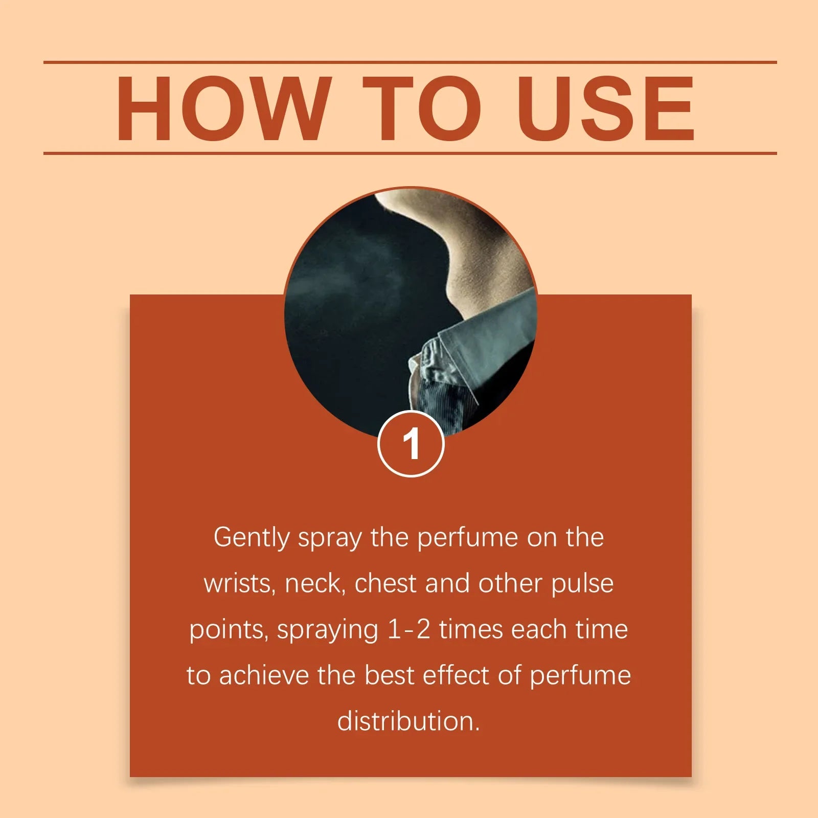 Gently spray the perfume on the wrists, neck, chest and other pulse points, spraying 1-2 times each time to achieve the best effect of perfume distribution.