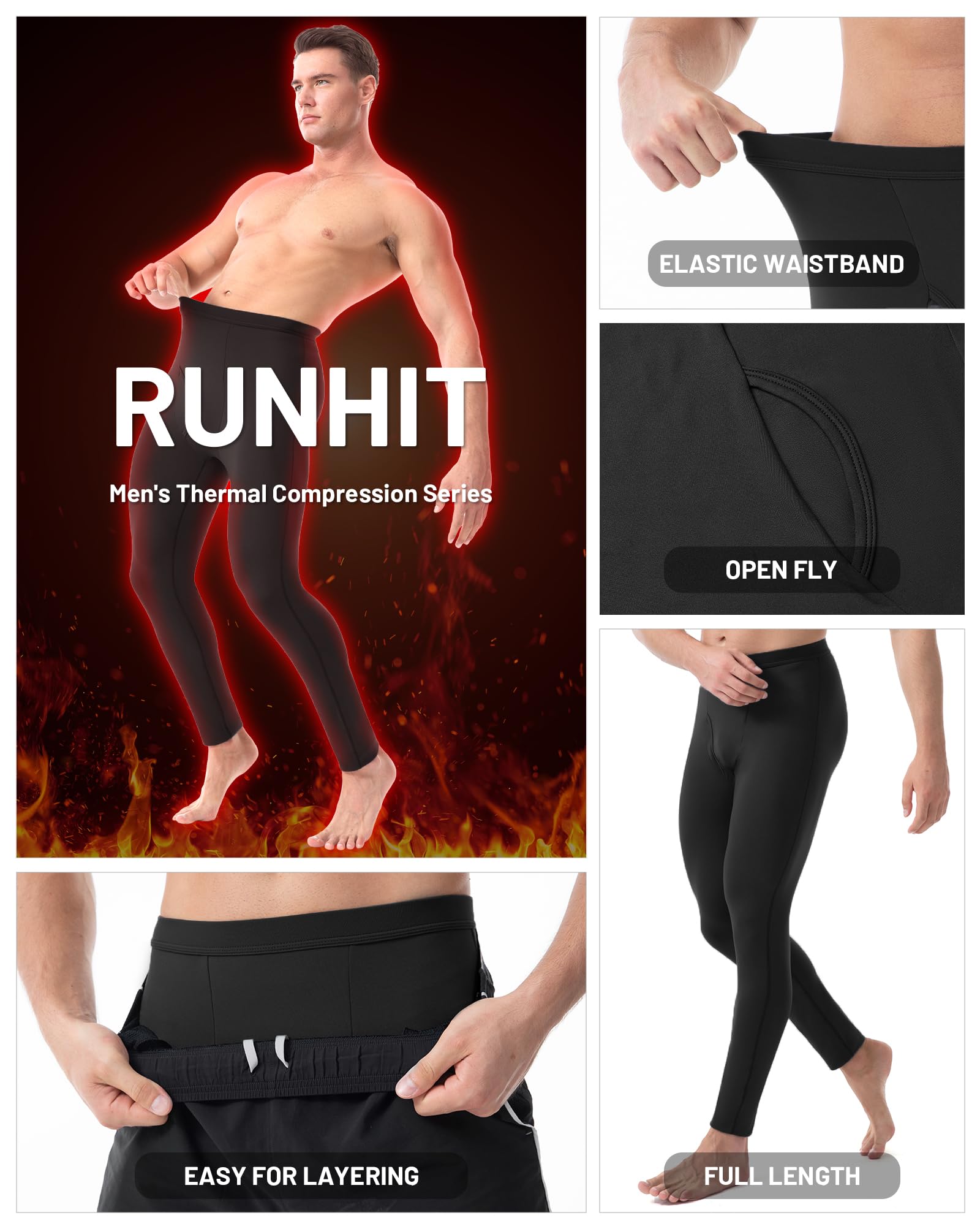 Runhit Long Johns for Men Thermal Pants with Fly Long Thermal Underwear Winter Cold Weather Fleece Thermal Bottoms, Black, Large