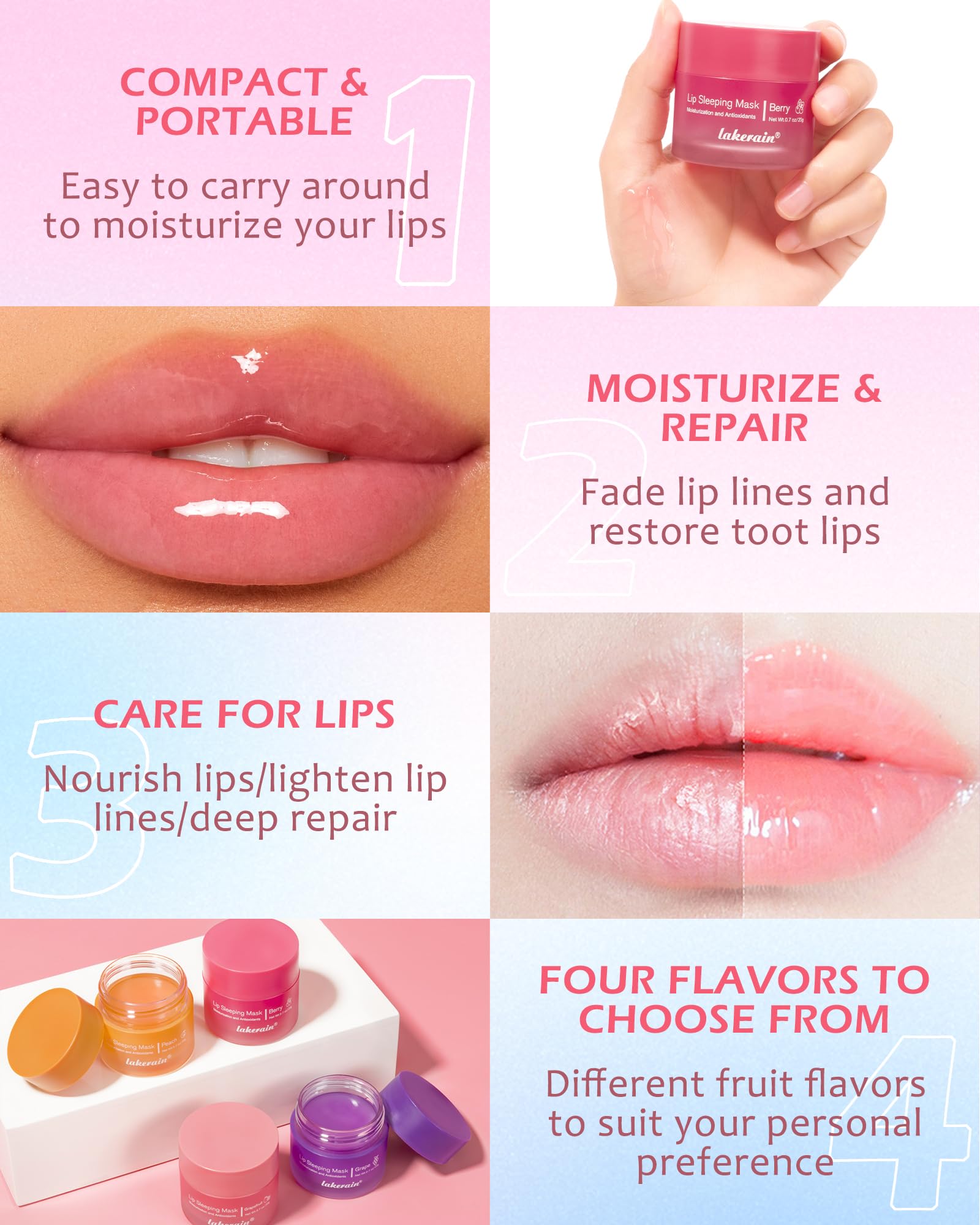 - HYDRATING LIP SLEEPING MASK - Hydrating lip moisturizer is a rich, glossy, high-intensity moisturizing effect. The 24 hours hydrating lip mask is bright and glossy, which can create a moist and plump lip effect, making your lips fuller and more vibrant. Lip conditioner comes in 4 flattering shades ranging from Peach, Berry, Grapefruit and Grape.