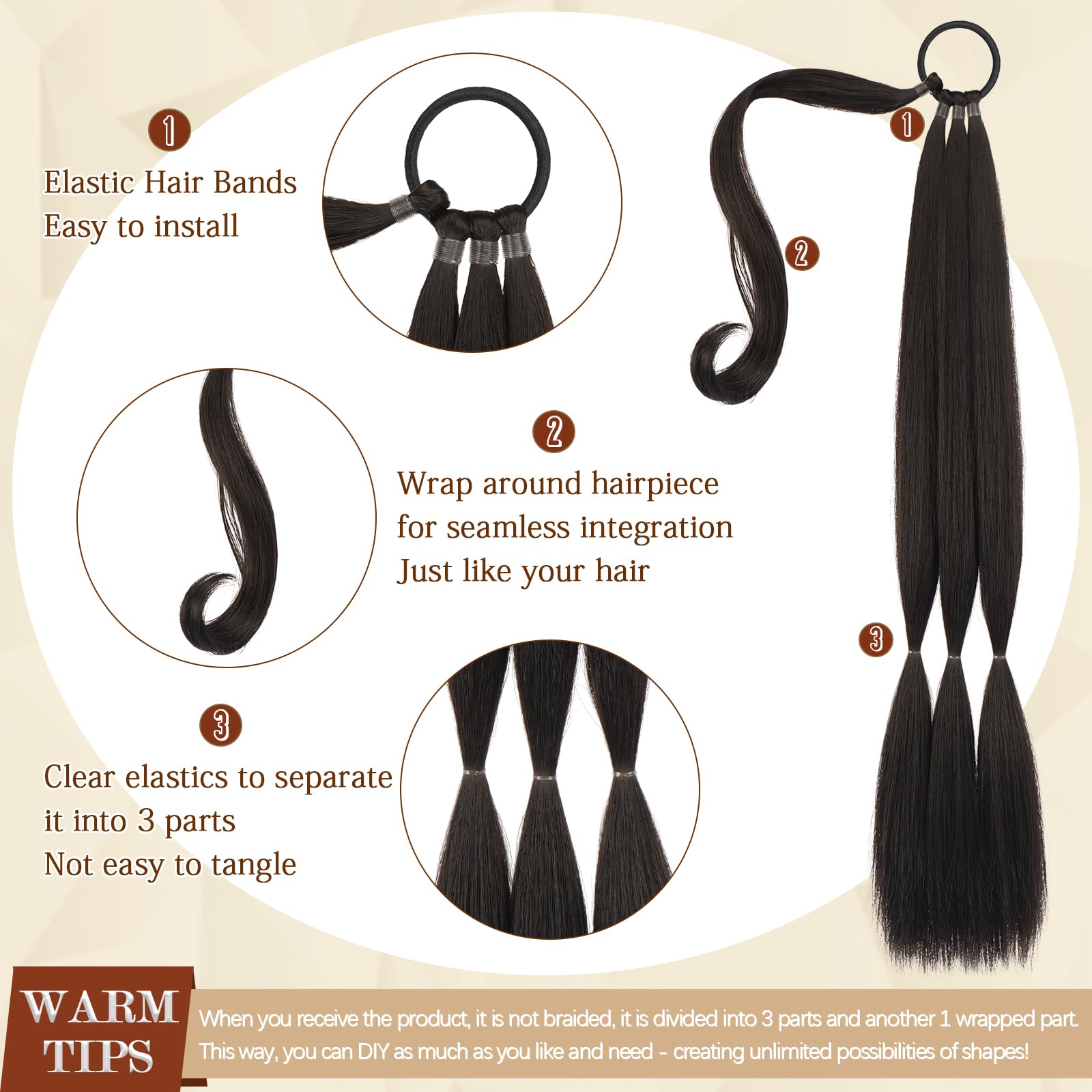 - How to Use : 1. Tie your hair into a ponytail. Then tie the synthetic hair piece for women to the ponytail; 2. Split your hair into three sections and braid them together with the three longer pieces of the ponytail extension; 3. Secure the braid with a clear elastic band and wrap the shorter pieces around.4. Secure it with bobby pins
