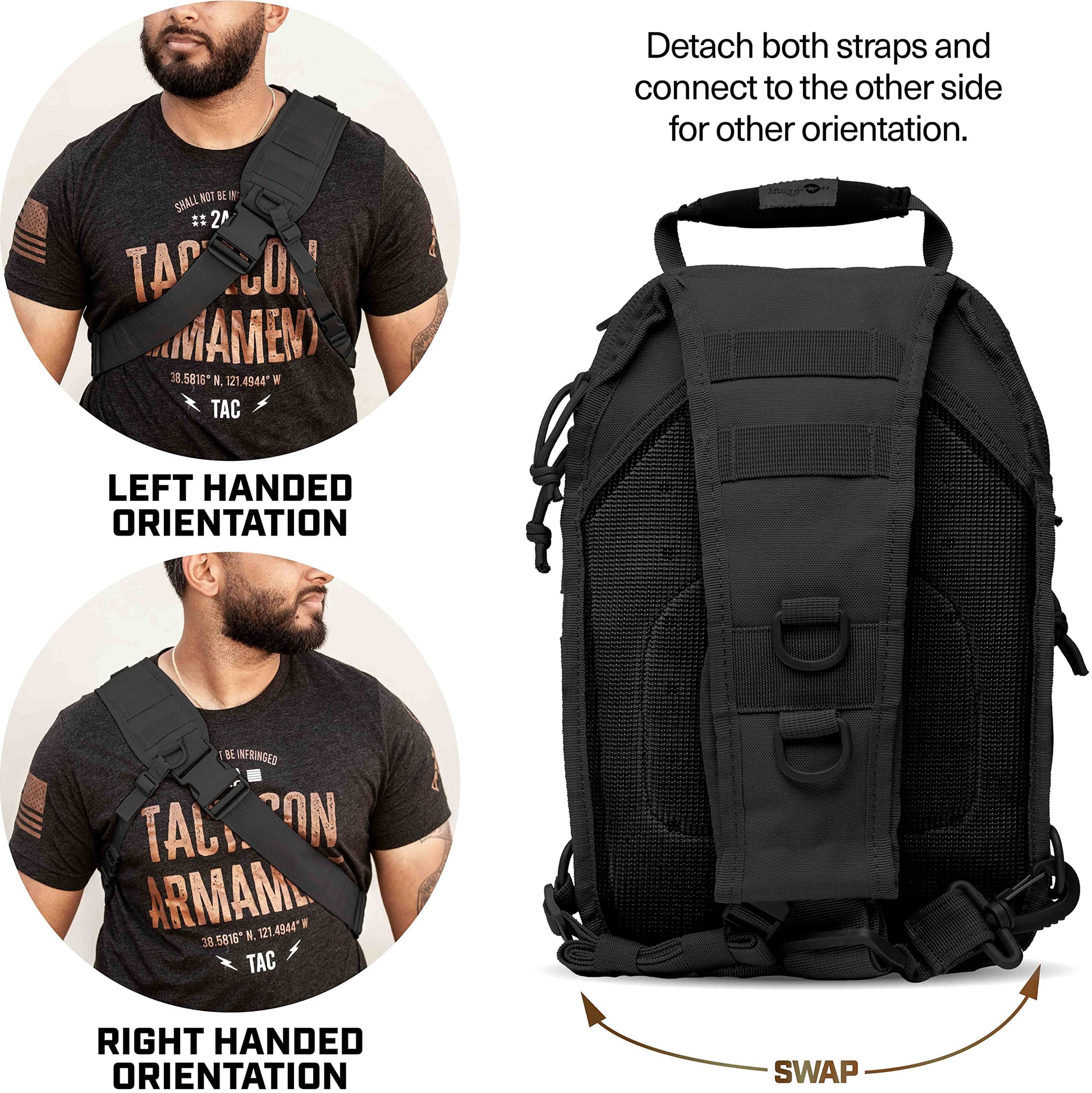 - TACTICAL EXCELLENCE: Equipped with a universal holster, this tactical bag securely accommodates any handgun. The adjustable and padded single shoulder strap ensures comfort during extended wear, while the sternum strap and belt attachment keep our small tactical backpack for men snugly against your body.
