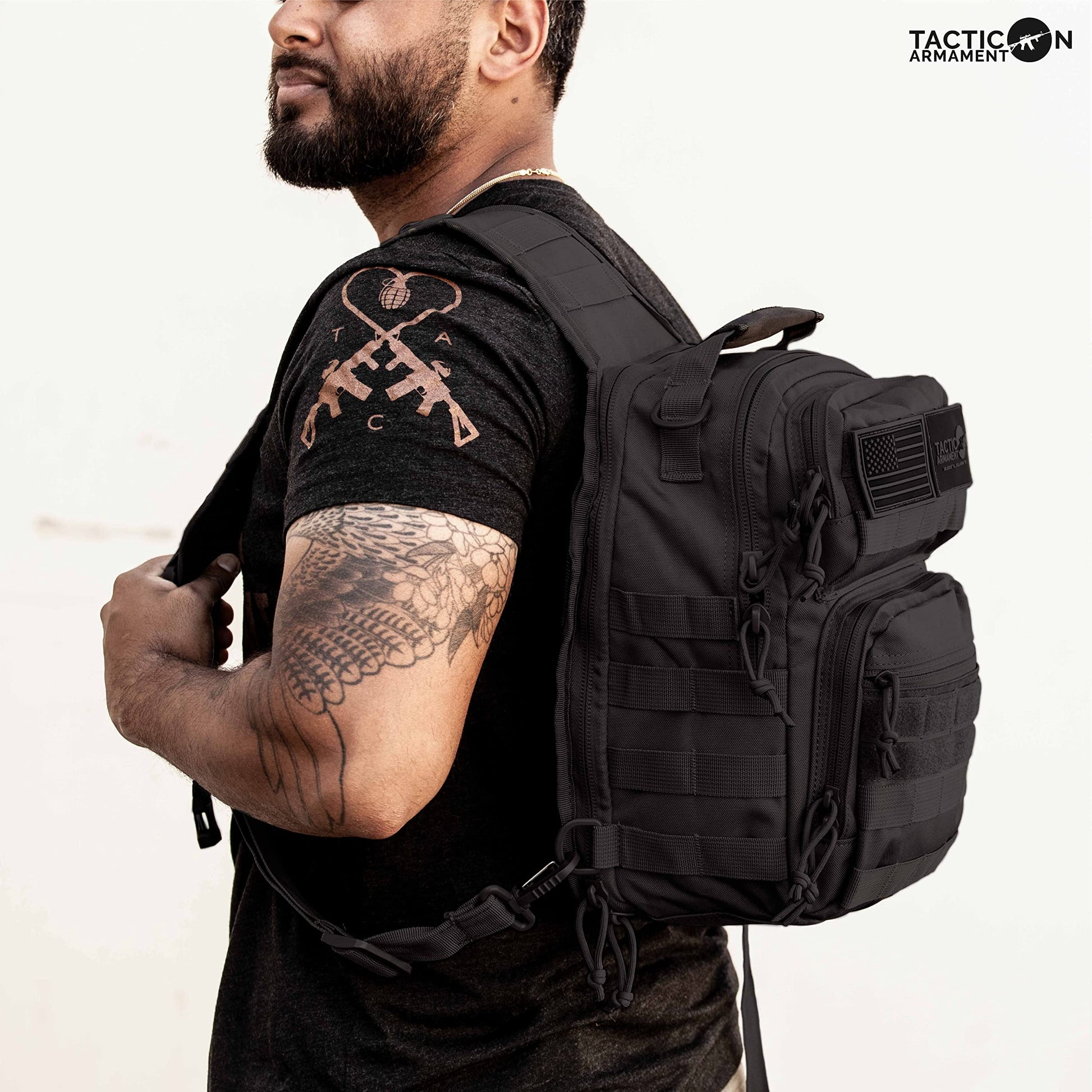 - RUGGED RESILIENCE: Crafted from 500D Nylon waterproof material, the Tacticon MOLLE backpack is designed for the boldest adventurers. This outdoor backpack adapts seamlessly to your needs – be it a 1-day bug out bag, range bag, hunting companion, or survival essential.