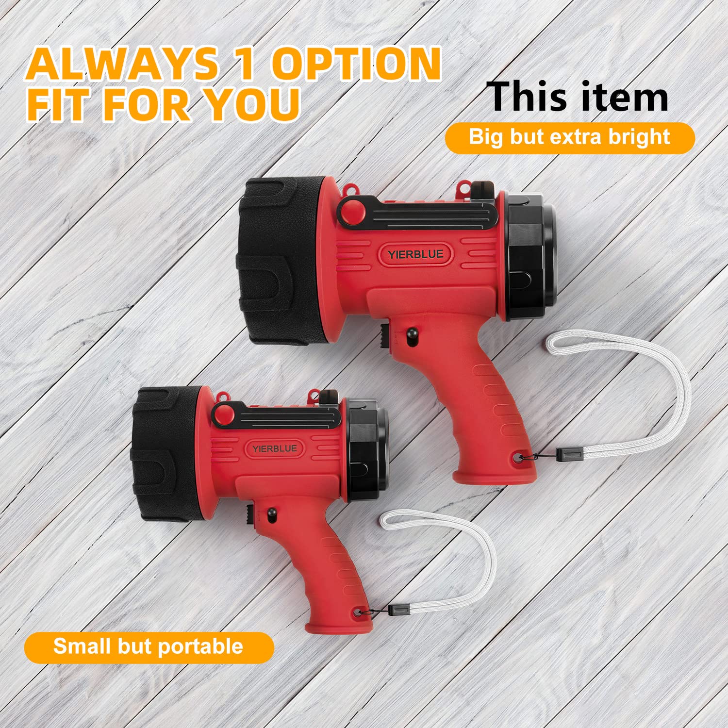 YIERBLUE Rechargeable Spotlight Flashlight with 1000,000 Lumen LED, IP67 Waterproof Long Running Spot Light searchlight, Impact Resistant Handheld Spotlight with Foldable Stand and Detachable Red Lens
