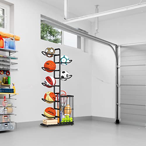 YIILII Multi-Function Sports Equipment Storage Racks - Adjustable and Durable Solutions for Organizing Balls, Toys, and Gear Indoors, in Garages, or Outdoors (5-Tier-Black-with Basket)