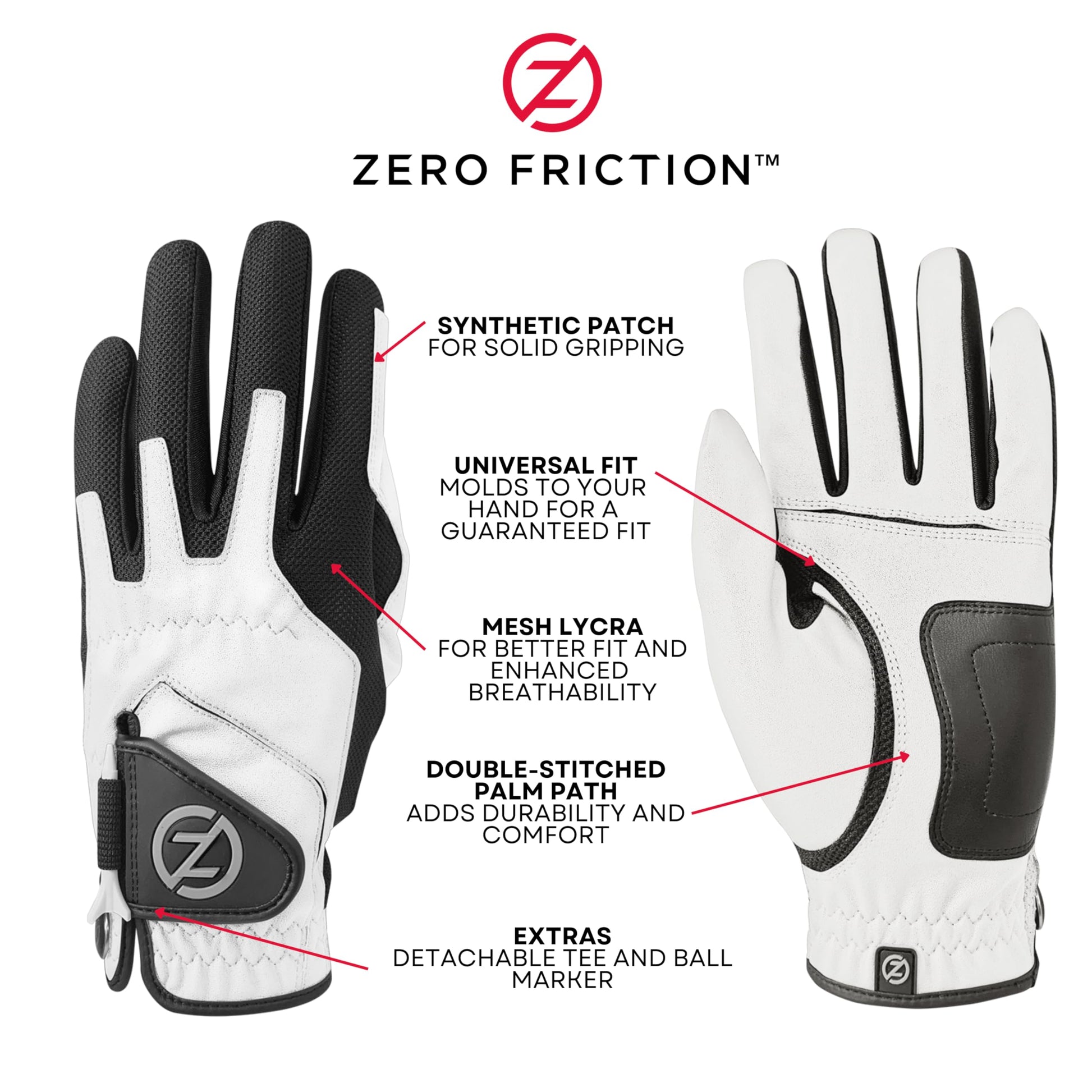 Details: Take the guesswork out of finding the perfect size glove. Zero Friction's Compression-Fit technology delivers outstanding precision, flexibility and comfort. All weather synthetic palm with a black color patch re-enforces the palm and adds durability. Smooth synthetic microfiber back, palm and fingers allow for maximum gripping. The glove come with a detachable tee and ball marker.